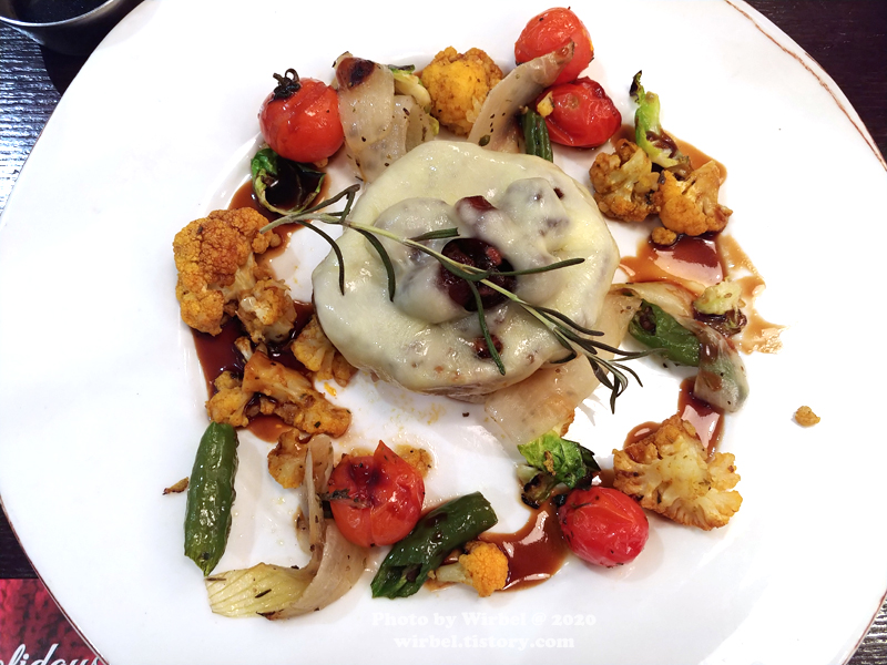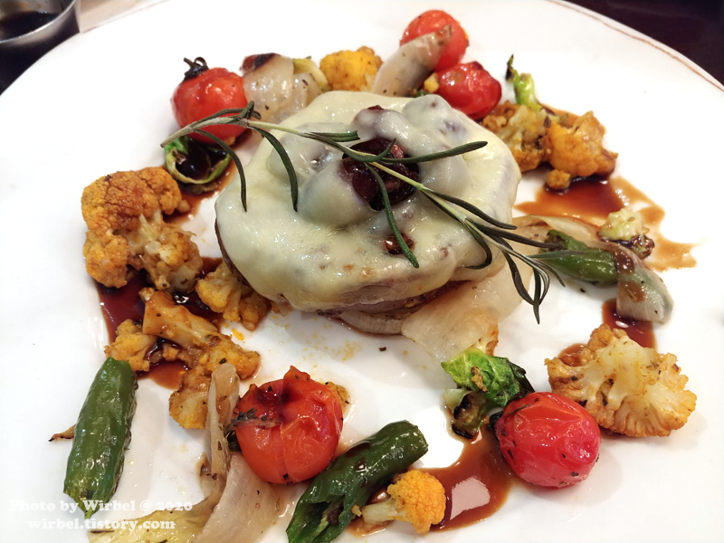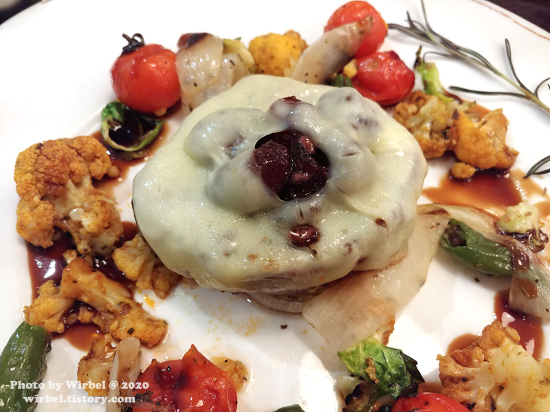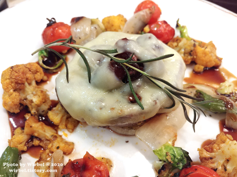안심 스테이크를 에멘탈 치즈가 감싸고 있습니다.