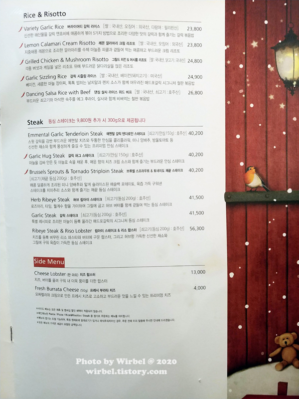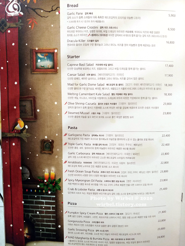 한줄평: 개성 있는 마늘 요리가 있는 곳! 방문 시기: 2020년 12월 이날 가격: 55,900원 시그니처 메뉴: 고르곤졸라피자 재방문의사: 있음 |