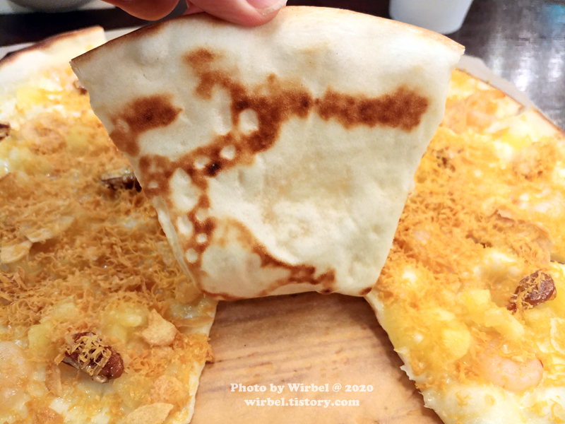 매드포갈릭 피자 도우는 매우 얇은 게 특징입니다.