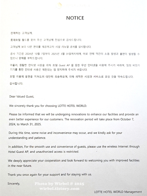 롯데월드호텔 공사는 2024년 10월 7일부터 2025년 3월 31일까지 하고 있습니다.