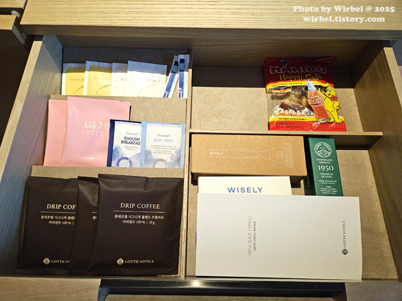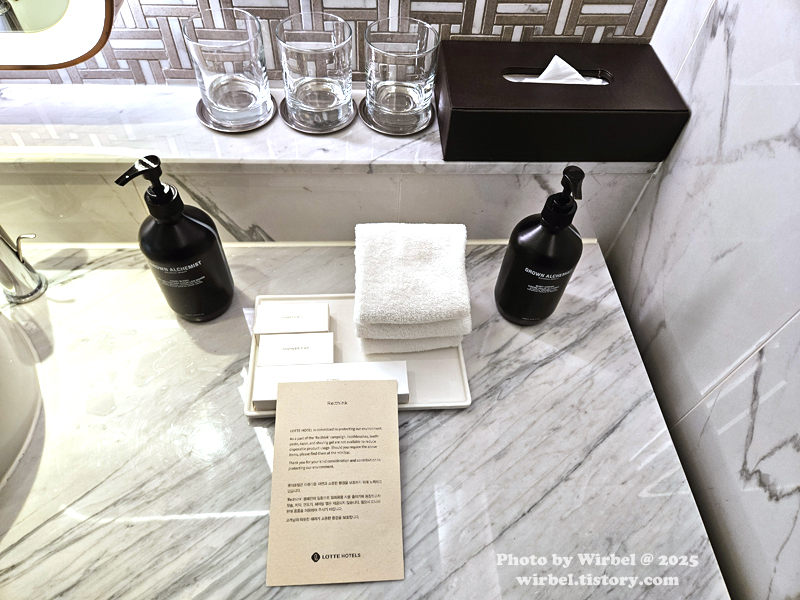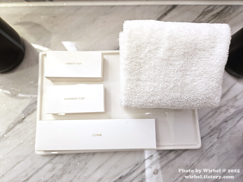 잠실 롯데호텔월드 어매니티로 배니티킷, 샤워캡, 빗이 있습니다.