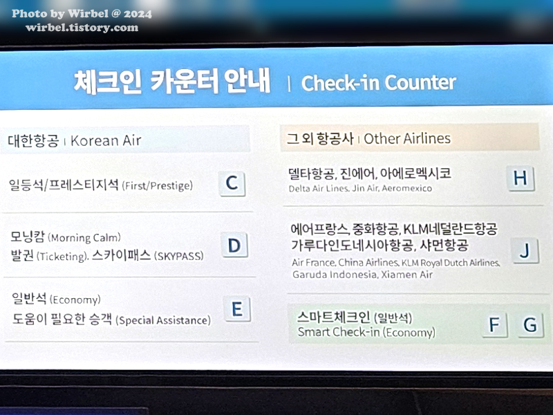 인천공항 2터미널 대한항공 체크인 카운터는 C,D,E 이고 진에어 체크인 카운터는 H 입니다.