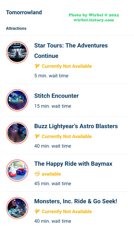 | 탑승 순서 | 어트랙션 | 예상 대기시간 | 이용 방법 | 실제 이용 시간 |