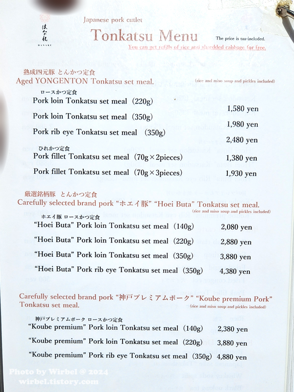 니혼바시 돈카츠 하지메 하나레 돈카츠 메뉴 가격.