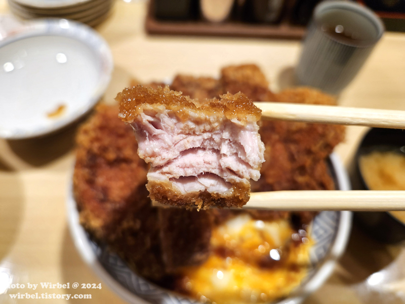 튀김옷은 얇고 돼지고기 등심과 잘 붙어 있으며 등심은 탱글탱글하게 부드러운 식감입니다.