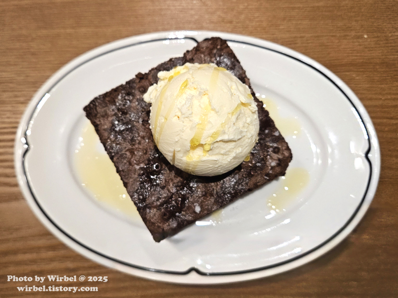 촉촉하게 구운 홈메이드 초콜릿 브라우니 위에 바닐라 아이스크림을 올리고,
