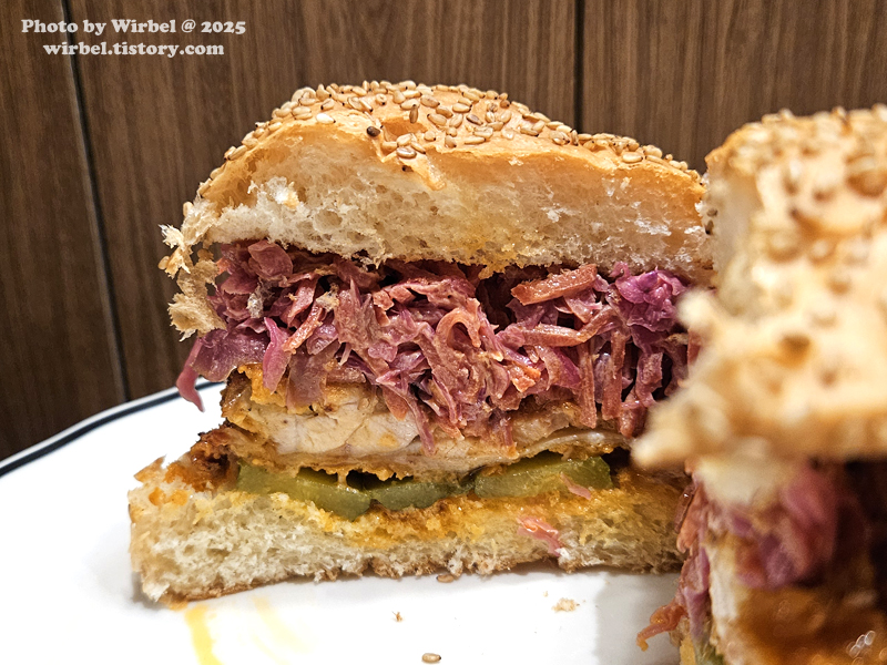신선한 코울슬루가 어우러진 르프리크의 내쉬빌 핫치킨 버거.