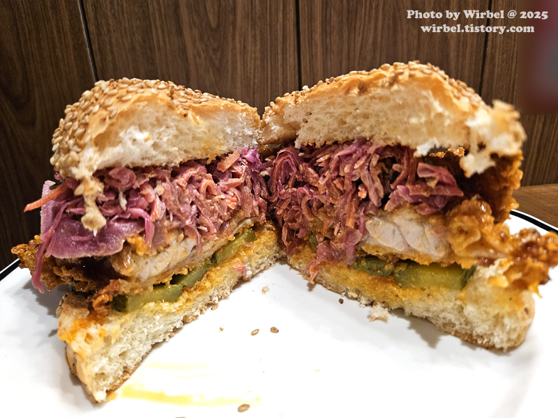 치킨 패티와 매콤하게 소스가 뿌려진 코울슬로를 함께 먹는 것이 좋습니다.