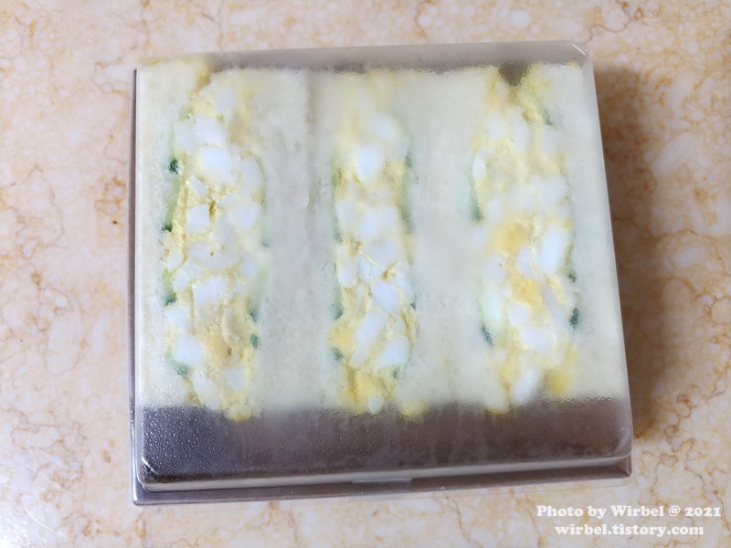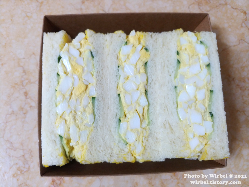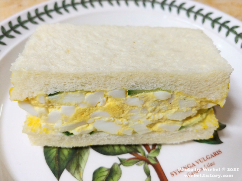 달걀샌드위치 한쪽은 얇고 한쪽은 도톰한 스타일입니다.