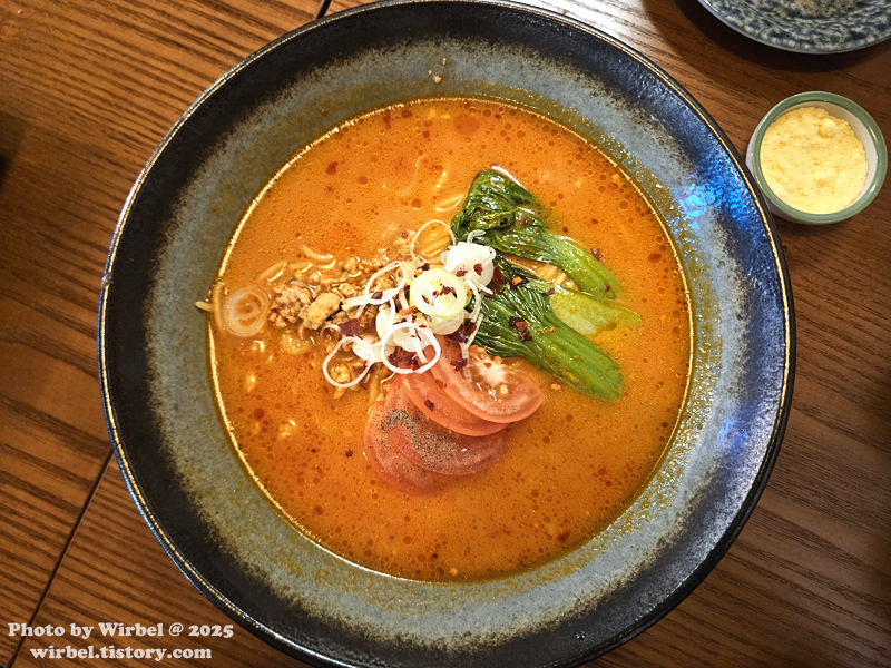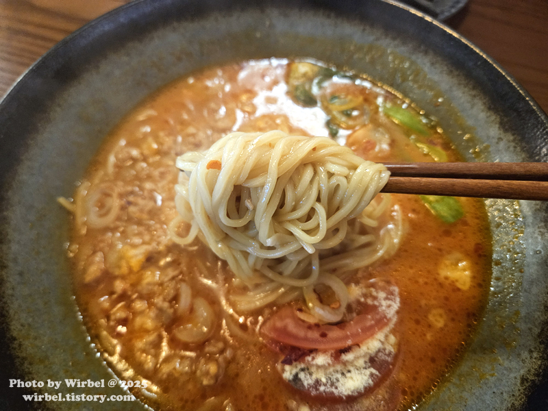 야키토리나루토 토마토라멘은 신맛이 강하진 않고 약간 매콤한 편입니다.