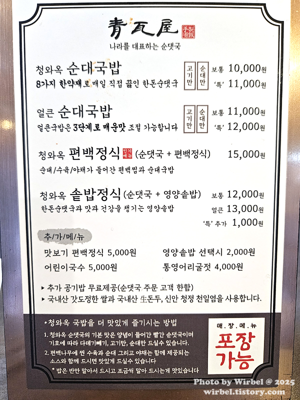 청와옥 순대국밥 보통 10,000원 / 특 11,000원.