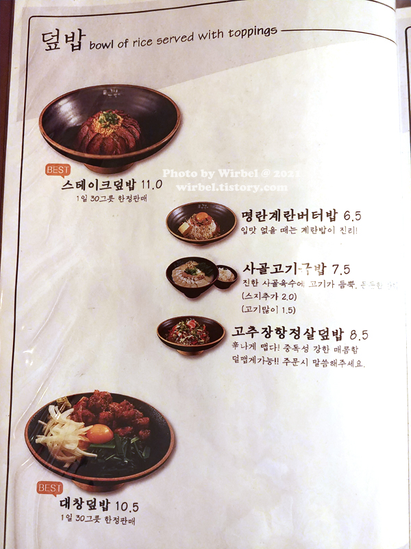 한줄평: 대창은 전골보다는 덮밥이 더 나았던 곳! 방문 시기: 2021년 4월 이날 가격: 31,900원 시그니처 메뉴: 대창덮밥 재방문의사: 근처에서 점심 간단하게 먹을 일 있을 때 |