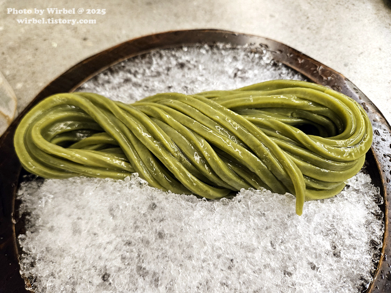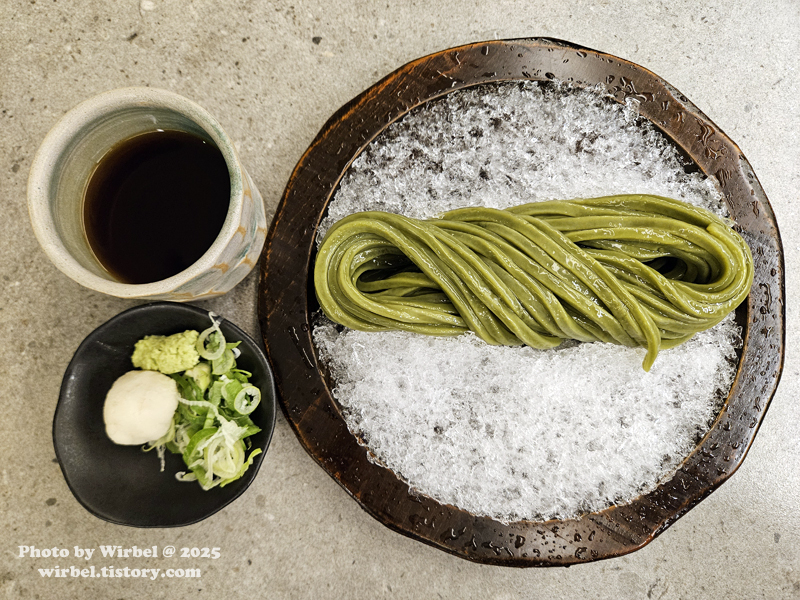 탱탱한 면발의 말차 면을 쯔유에 찍어서 먹어봅니다.