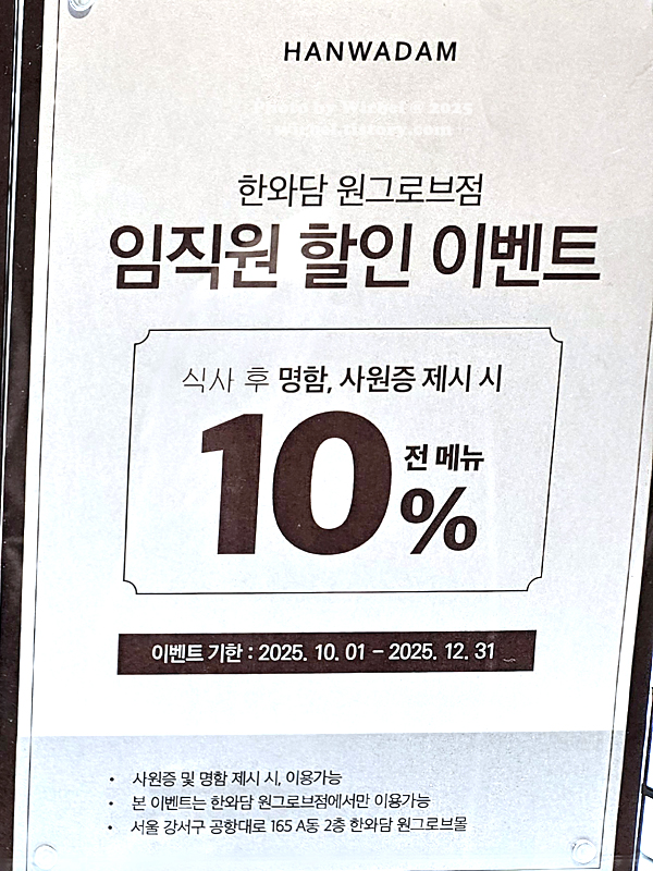 한와담 원그로브점은 근처 회사 임직원들 10% 할인 행사를 진행하고 있습니다.