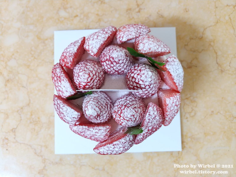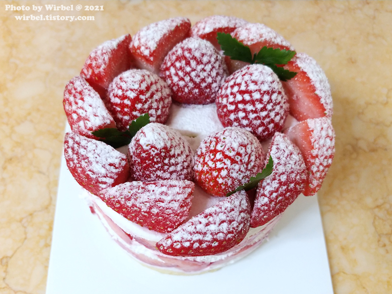 시트는 3단으로 시트 사이에 딸기와 생크림이 채워져 있습니다.