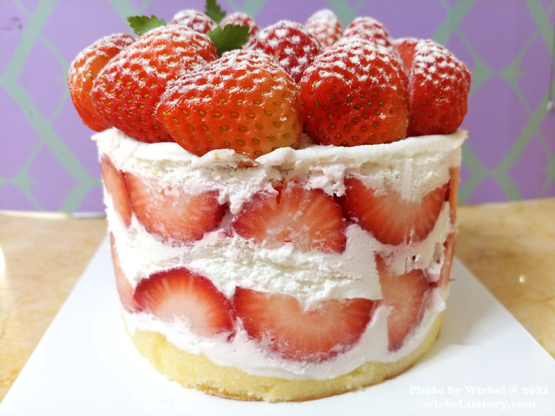 시럽을 바르지 않고 갓 구워 신선한 제누와즈와 100% 우유 생크림, 신선한 생딸기의 만남.