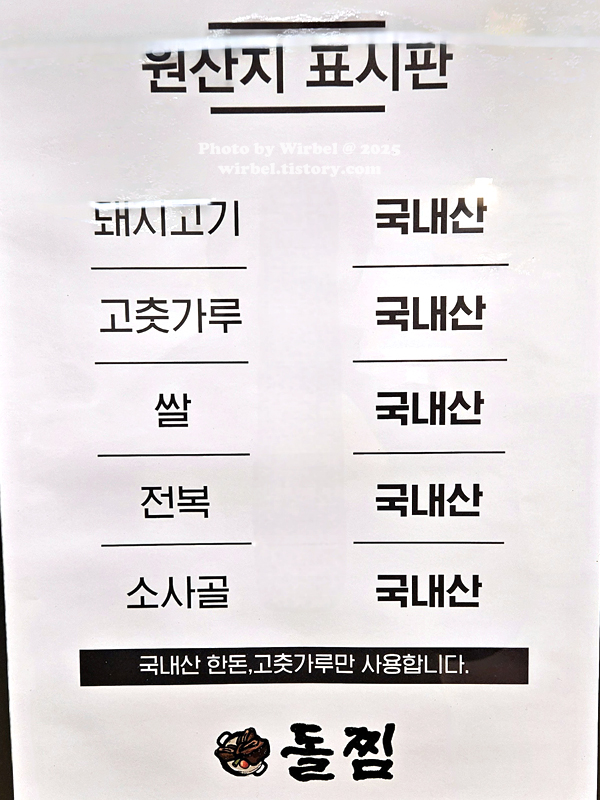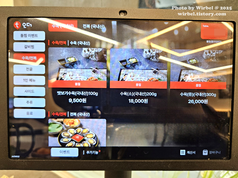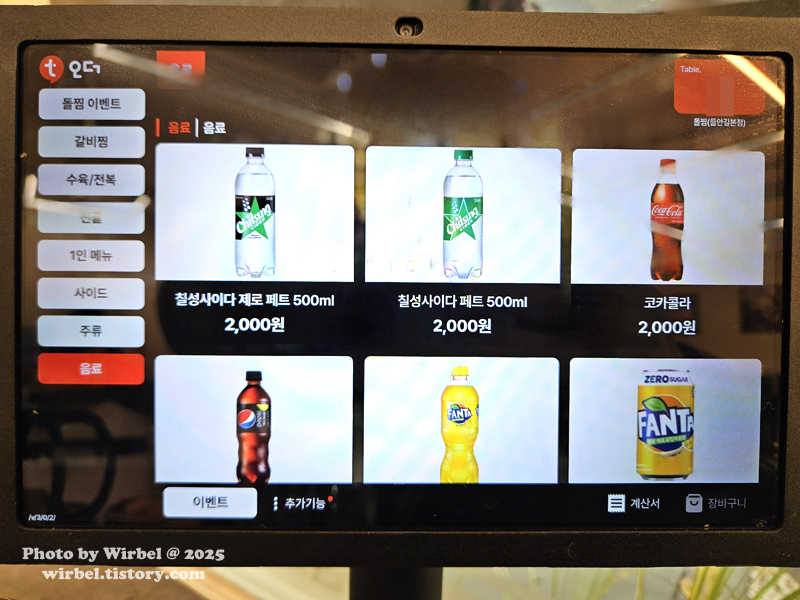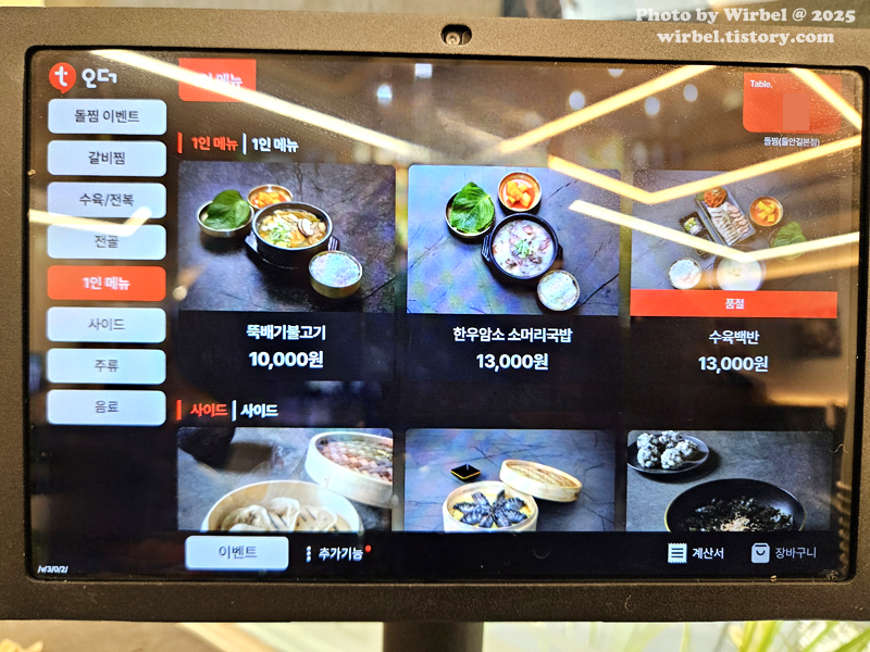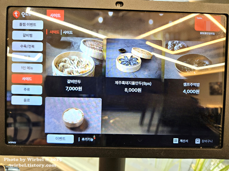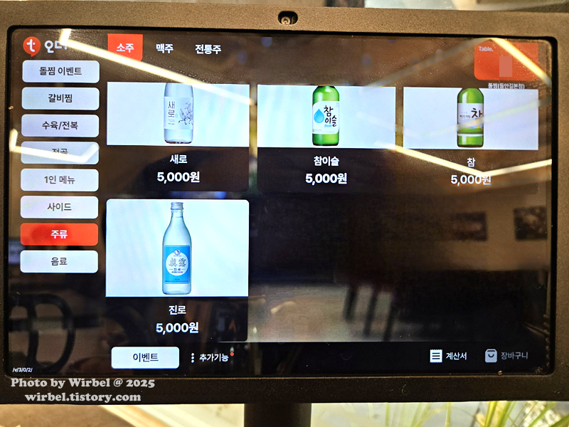 돌찜은 t오더 태블릿으로 테이블에서 주문하는 방식입니다.