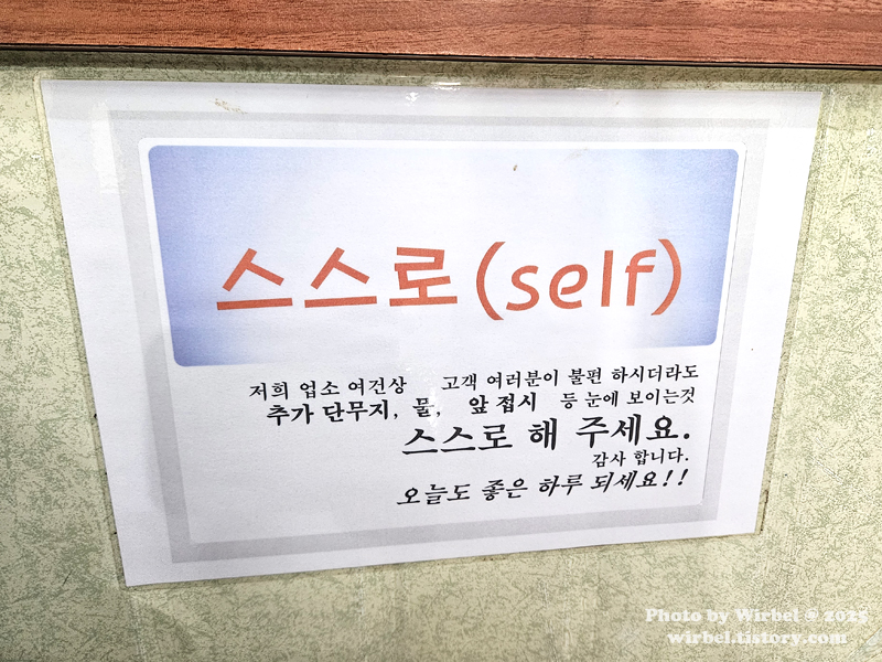 물, 추가 단무지, 추가 앞접시는 셀프입니다.