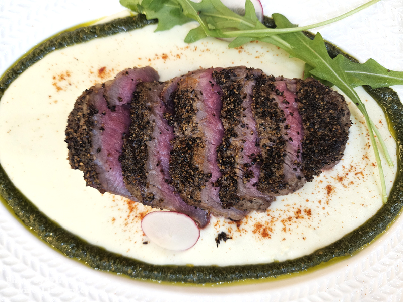 스테이크 주변에는 바질 소스(?)가 곁들여져서 나옵니다.