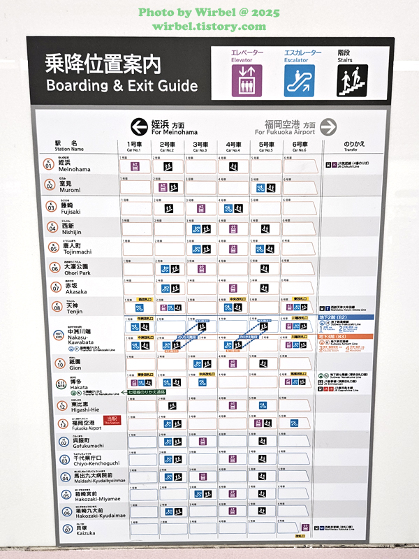 후쿠오카 전철은 각 역마다 출입구 위치를 표시해 두었습니다.