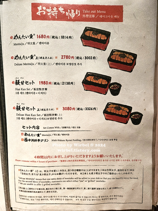 원조하카타멘타이쥬 명란덮밥 테이크아웃 메뉴 가격.