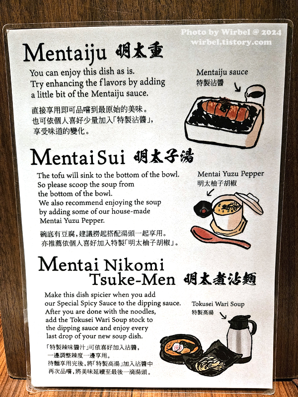취향에 따라 멘타이쥬 특제 소스를 조금씩 곁들이면서 맛을 변화를 즐겨보세요.