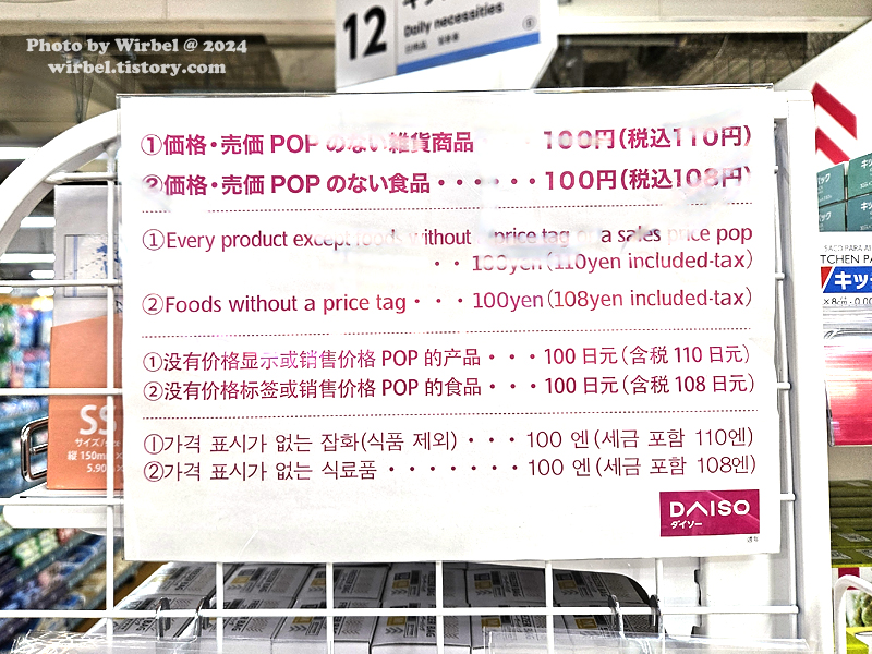 일본 다이소 가격은 100엔이고 세금 포함하면 잡화는 110엔, 식료품은 108엔입니다.