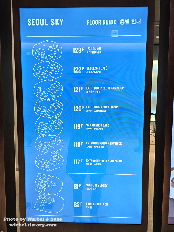 서울 전망대 서울스카이는 롯데월드타워 지하 1층, 지하 2층, 117층~123층에 있습니다.