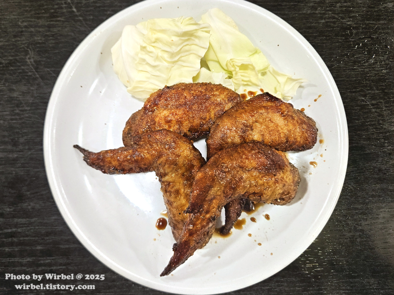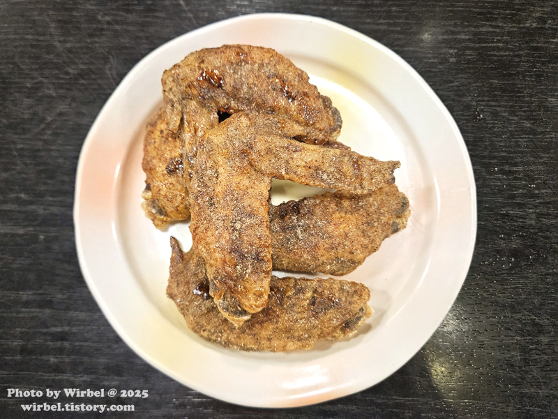 짭조름하게 양념이 되어 있는 닭날개튀김입니다.
