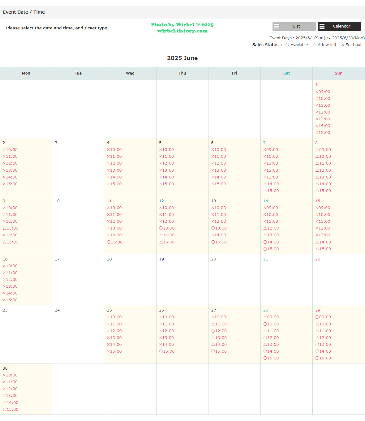 2026년 6월 표의 경우에도 인기가 좋은 오전 시간은 이미 품절이 되어 있습니다.