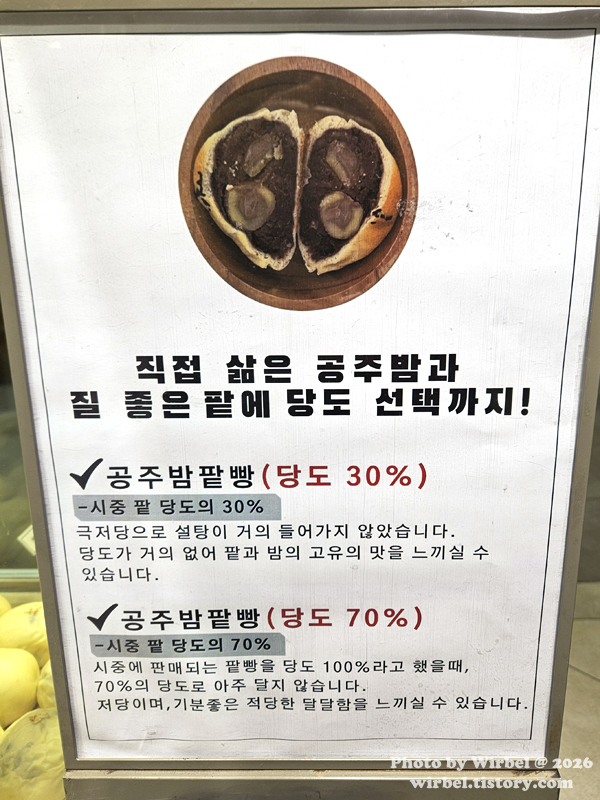 천호 현대백화점 빵집 하츠베이커리 당도 30%와 당도 70% 공주밤팥빵을 판매하고 있습니다.