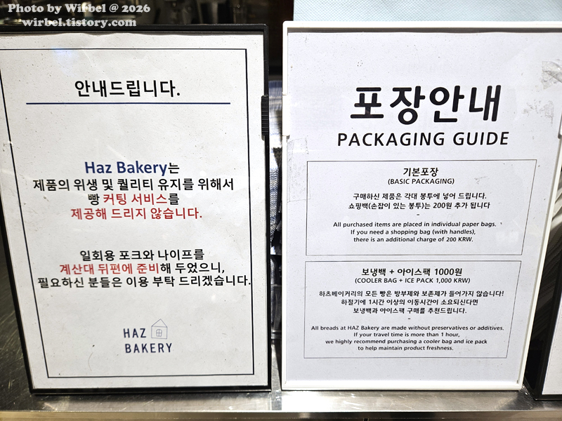 하츠베이커리 기본포장은 각대봉투에 하고 쇼핑백은 200원 추가됩니다.
