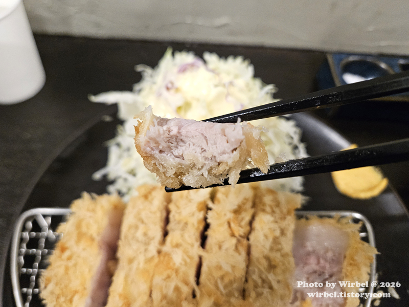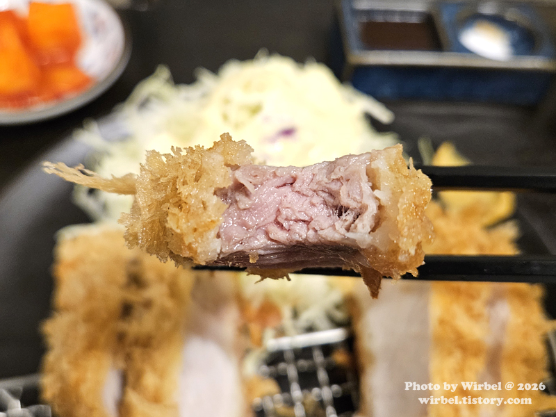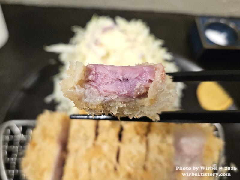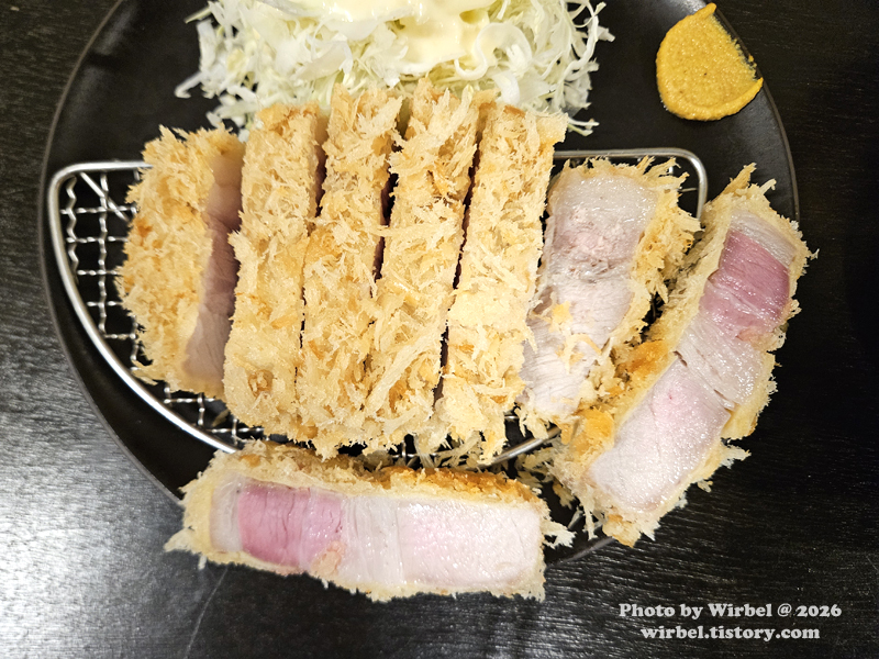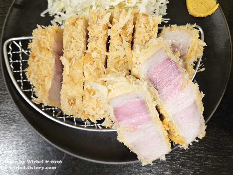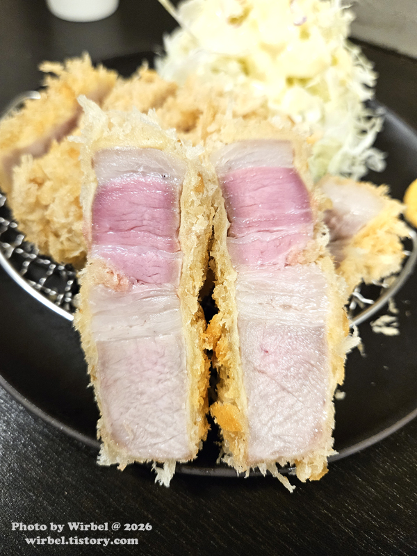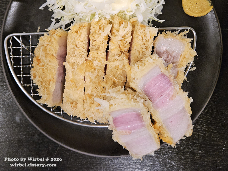 보통 돈카츠를 수직으로 컷팅했다면 이것은 수평으로 컷팅한 느낌으로 육질이 살아 있는 것을 여실히 보여줍니다.