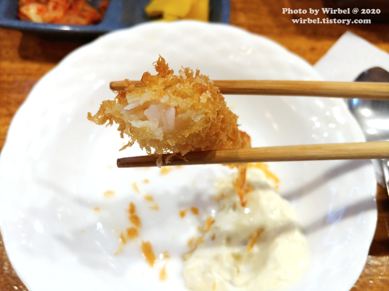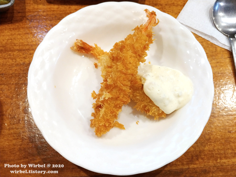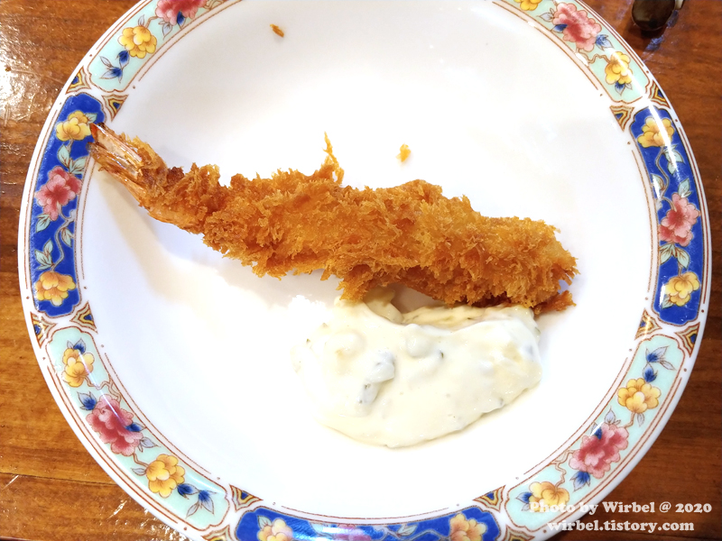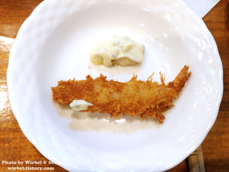 돈카츠처럼 바삭한 빵가루가 붙어 있는 새우튀김입니다.