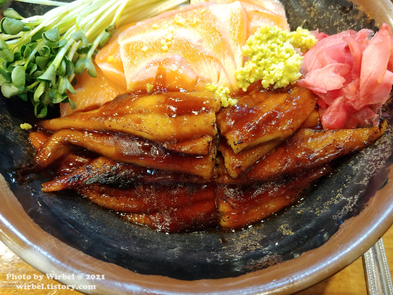 연어와 장어를 한 번에 먹을 수 있는 콤보 메뉴입니다.