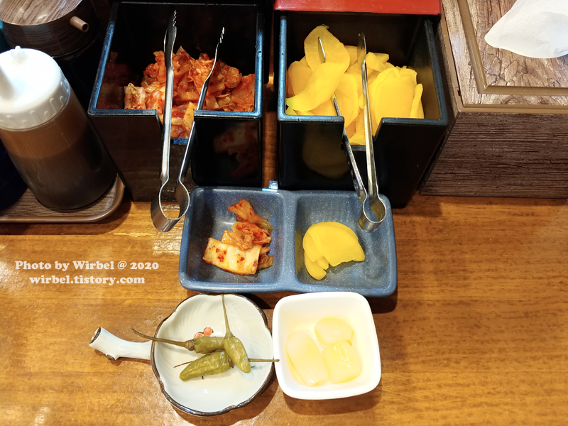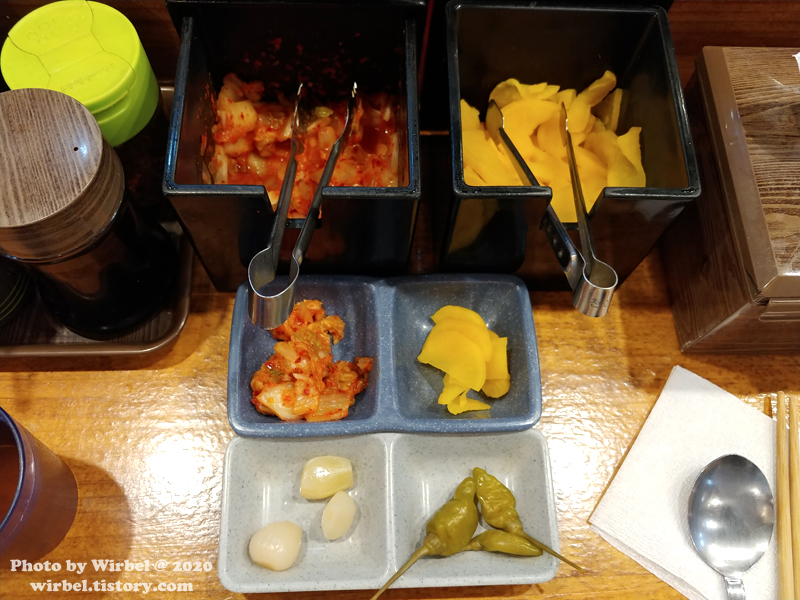 밑반찬 김치, 단무지, 락교, 할라피뇨.