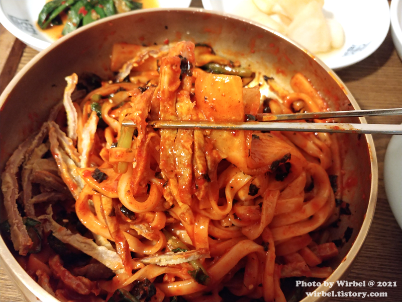 매콤한 양념이 칼국수에 잘 비벼졌습니다.