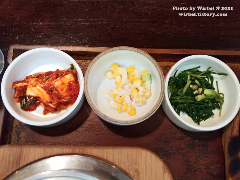 밑반찬 김치, 옥수수 샐러드, 나물무침.