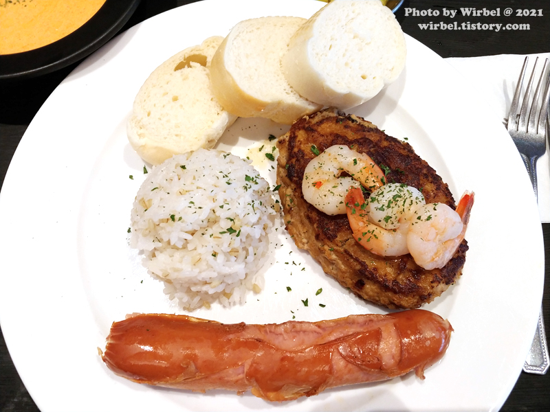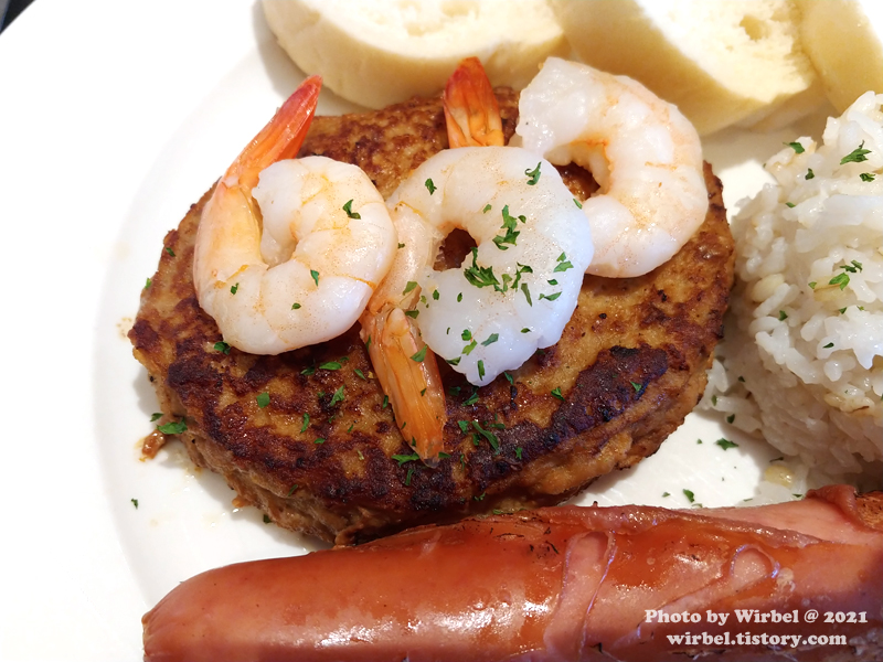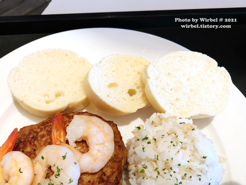 함박 스테이크 위의 새우는 함박 내오기 전에 준비된 것을 그대로 얹어줍니다.