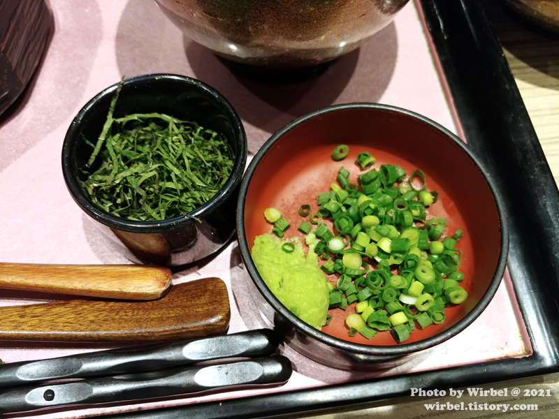 두번째 드실때 히쯔마부시를 밥공기에 덜어 깻잎, 파, 와사비를 밥 위에 얹어서 가볍게 섞어 드세요.