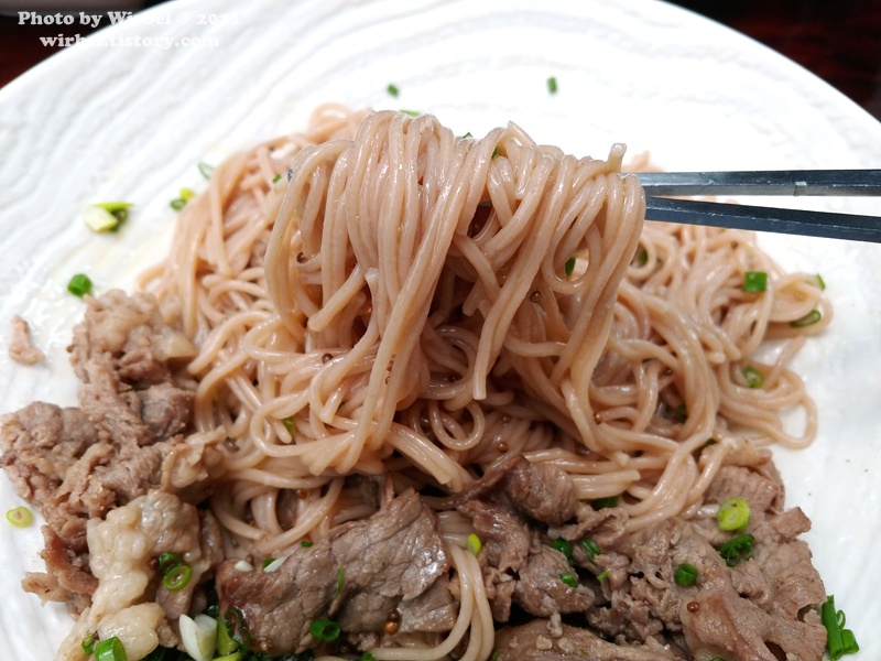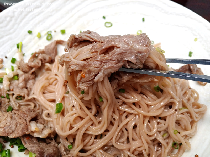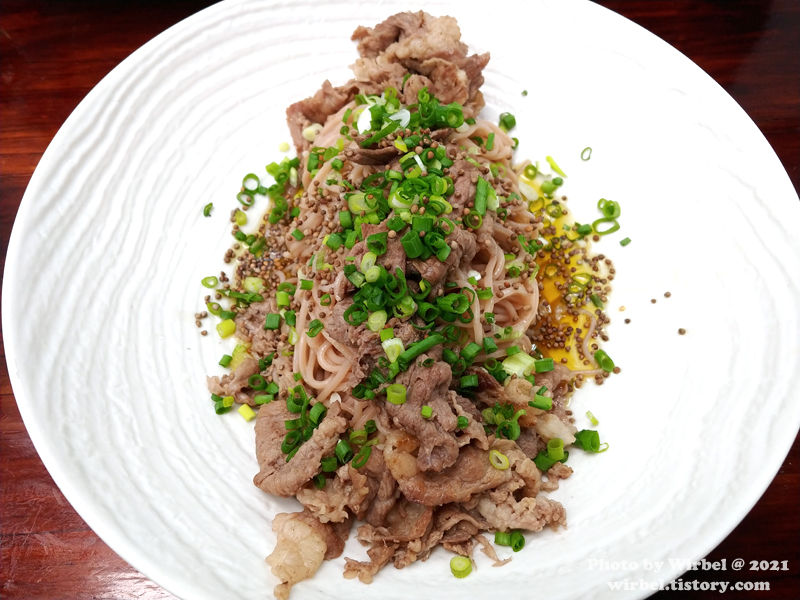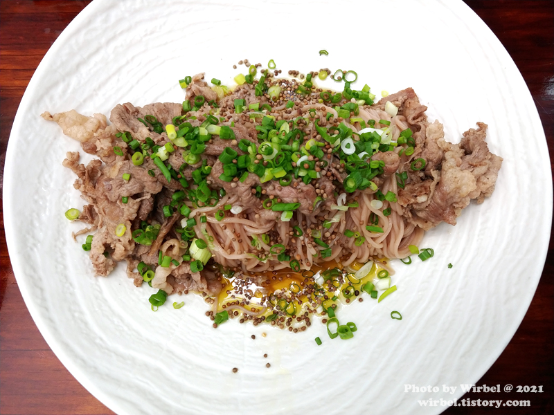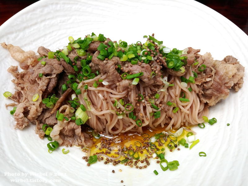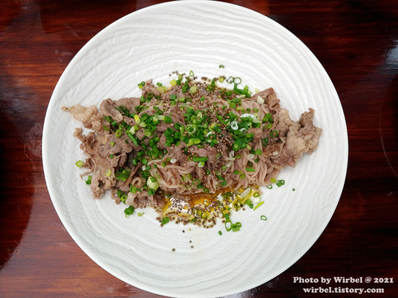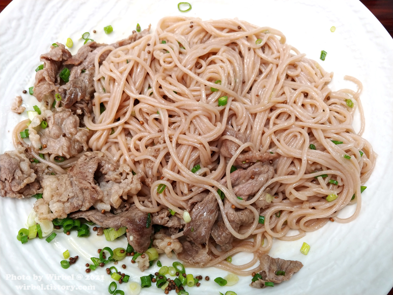 차돌박이와 면이 잘 어우러지는 들기름 국수입니다.