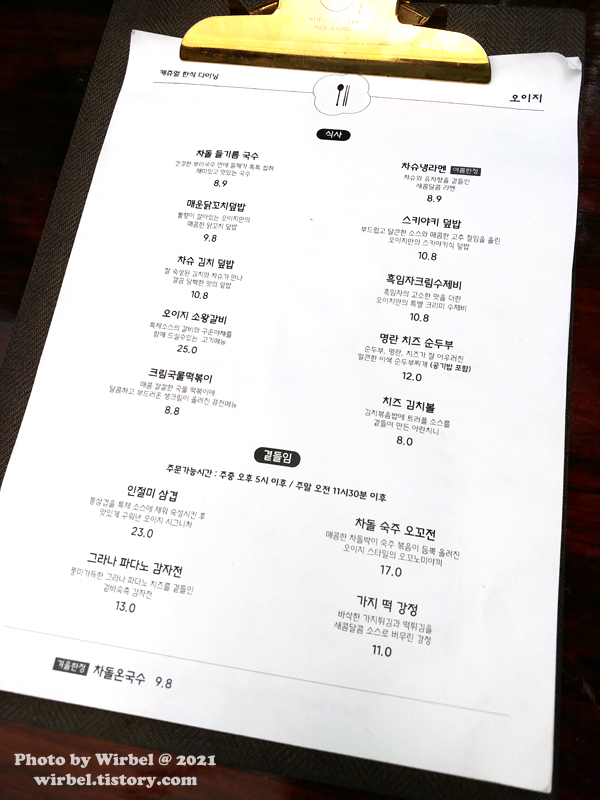 캐쥬얼 한식 다이닝 오이지 메뉴.