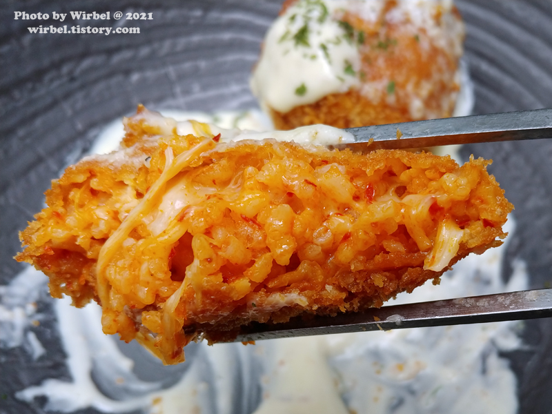 김치볶음밥에 치즈가 들어간 친숙한 맛으로 튀김옷도 바삭합니다.