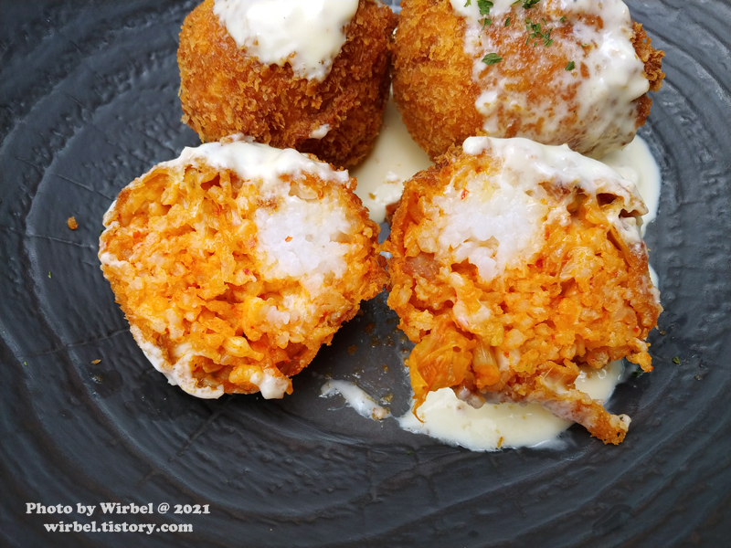 김치볶음밥에 트러플 소스를 곁들여 마든 아란치니.