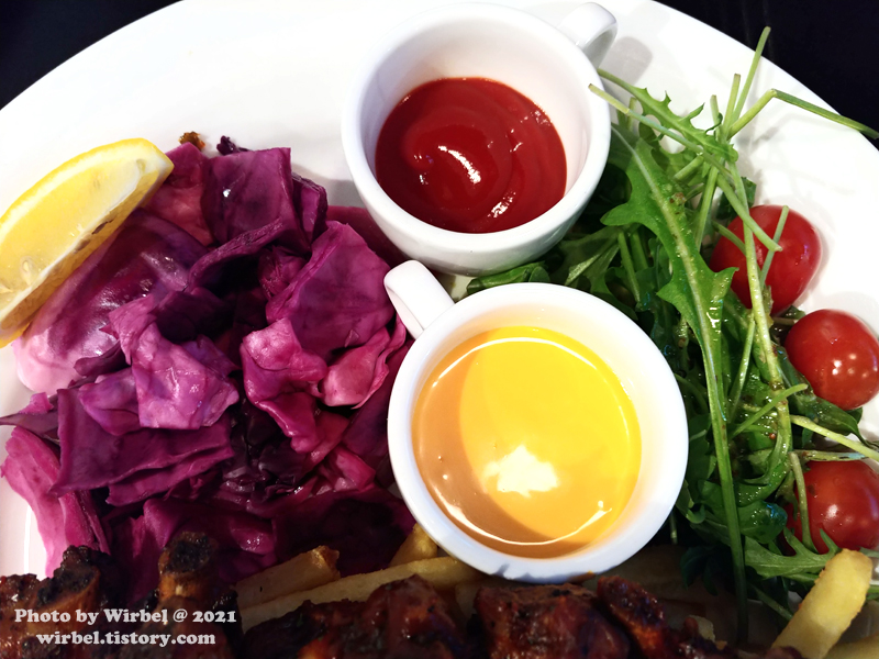 양배추절임, 채소샐러드, 방울토마토가 나오고 케첩과 치즈 소스가 나옵니다.