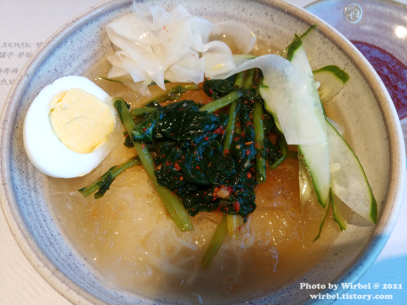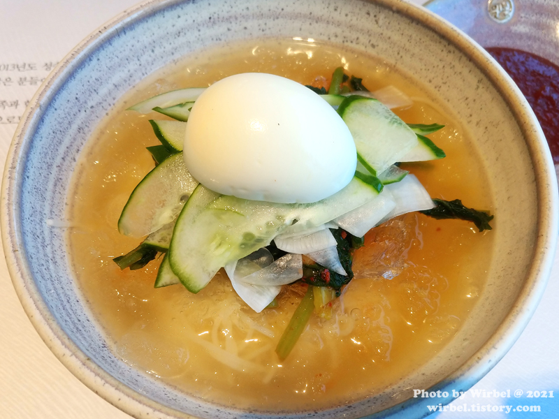 고명으로 삶은달걀, 열무김치, 오이, 무가 얹어져서 나옵니다.