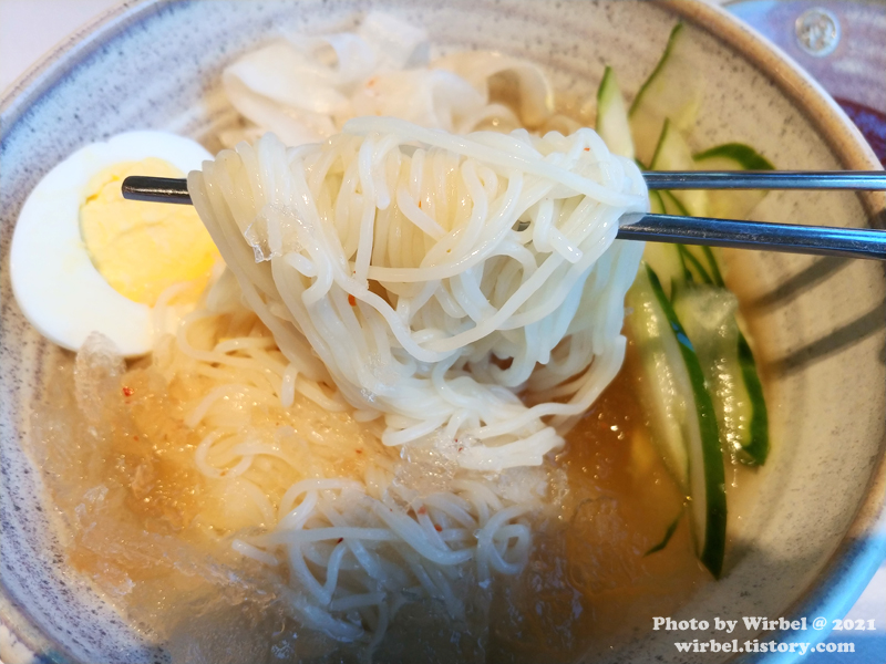 얼음 동동 육수에 시원하게 먹을 수 있는 국수입니다.