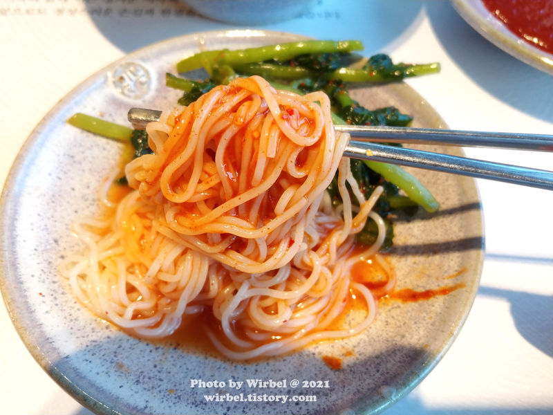 양념과 섞어서 먹으면 친숙한 매콤달콤한 비빔국수입니다.