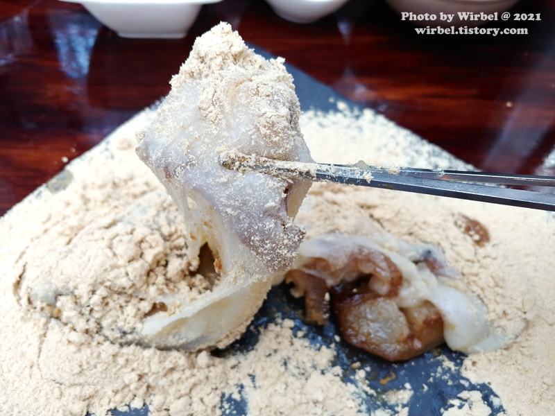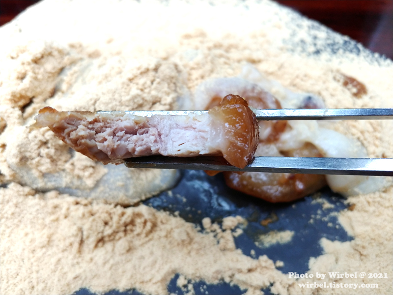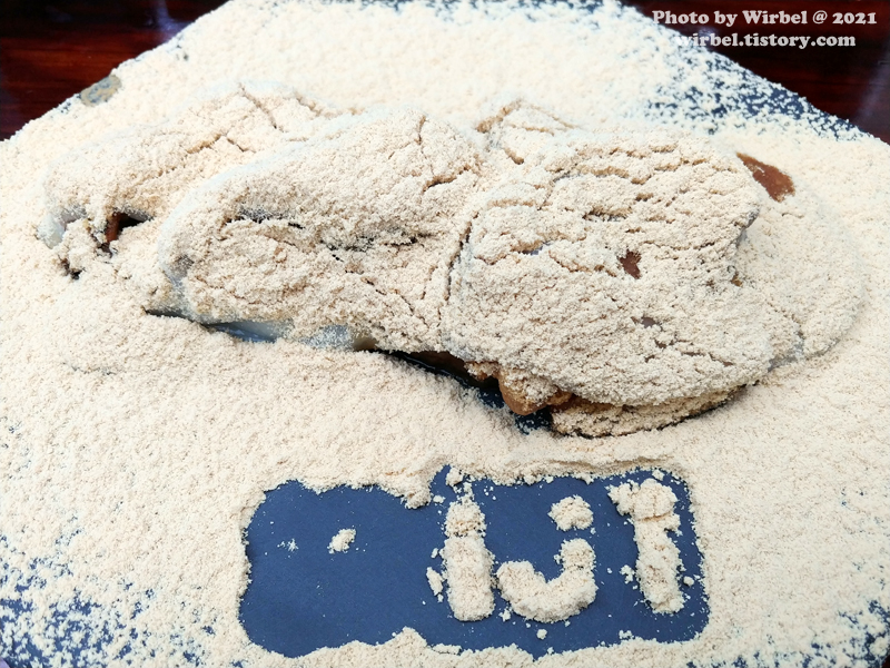 울퉁불퉁 커다란 인절미에 콩고물이 팍팍 뿌려져 있습니다.