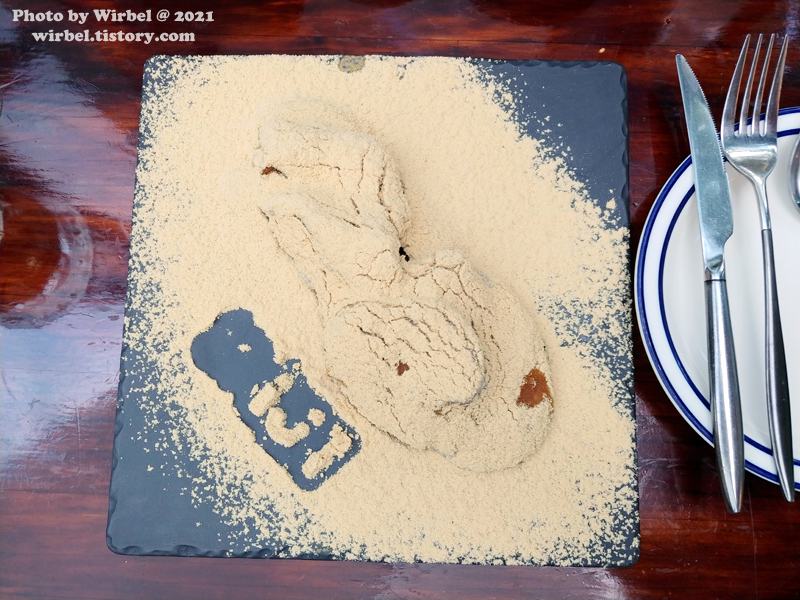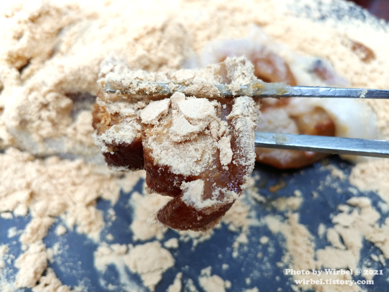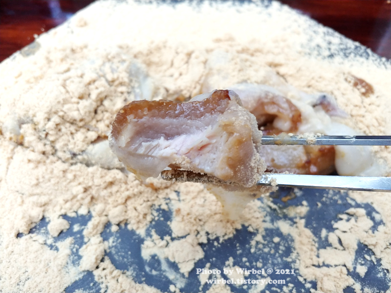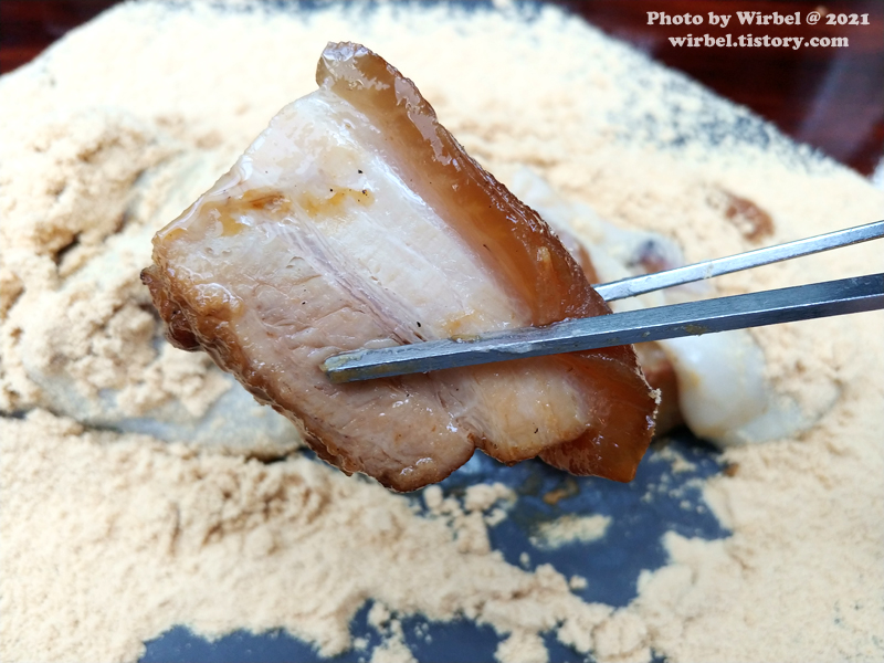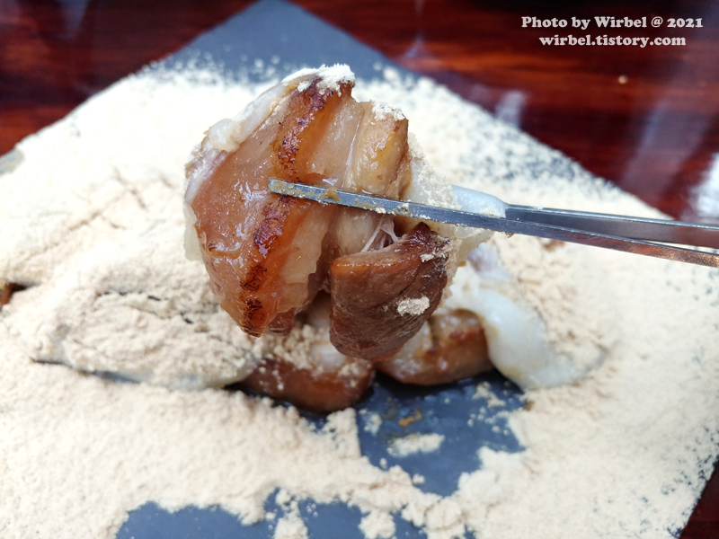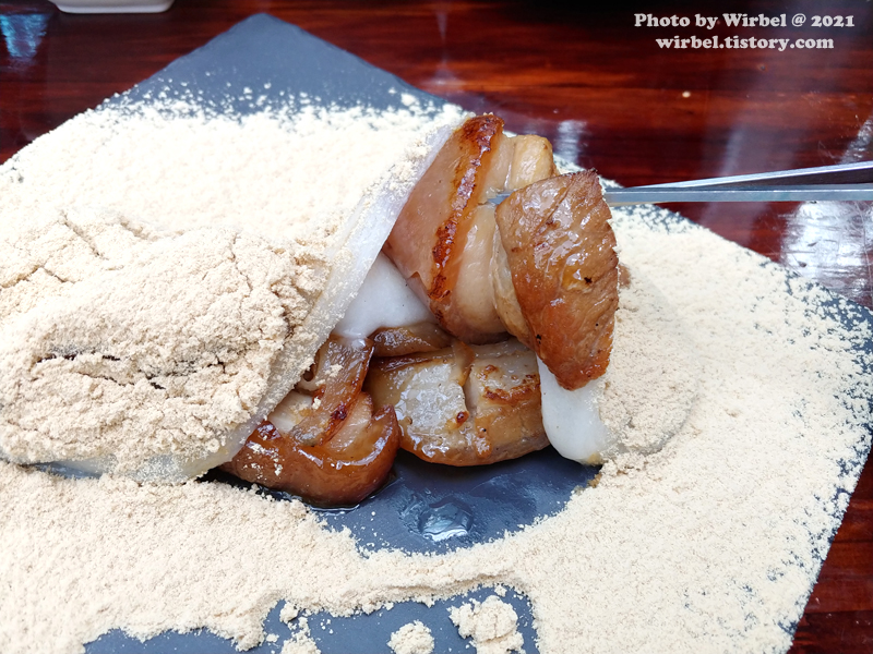 삼겹살을 콩고물에 콕 찍어서 먹으니 고소함이 있습니다.